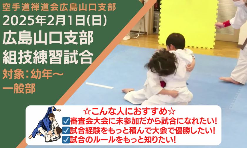 | 時間 | 対象:少年部~一般部 白帯~黒帯 ※幼年・小1から参加できます。 時間: (9:00係集合~会場設営) 10:00選手集合 10:10開始 12:30終了予定 選手は解散、遅くとも13:00には終了します。 以降、対象は中学生上級者~高校生~一般部です。 13:00~ 審判講習会 中学生上級者~大人 禅道柔術審査会 高校生以上 16:00終了予定 16:30撤収終了予定 |